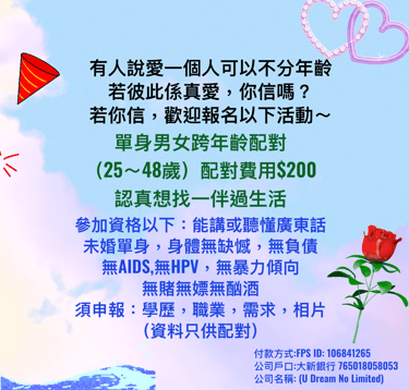 跨年齡單身配對(一對一),歡迎報名活動~到時平台會核對資料,確保資料準確,而所得資料不會作其他商業用途.有興趣者填上方:跨年齡單身登記表格~平台收集資料後,會逐一進行電話視頻了解登記者需求,而部分資料(個人照,學歷,入息證明)須Wtps +85268789453上傳核對.